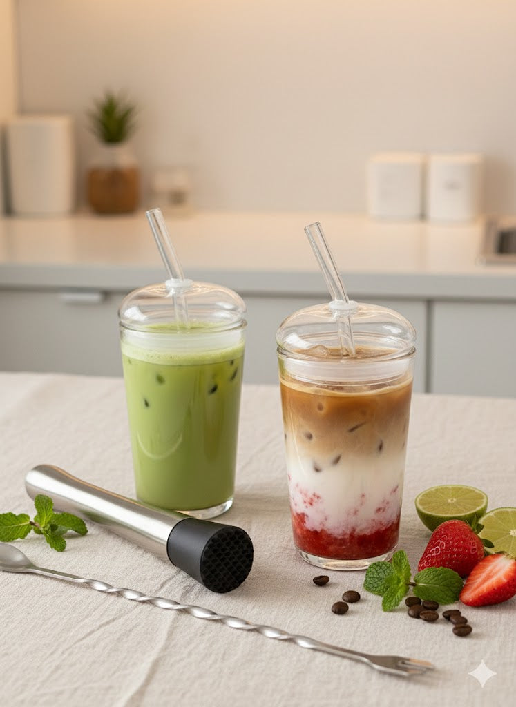 Each kit includes 1 glass cup with lid + straw, a prep tool set (muddler + spoon), a Ritta Eats welcome card, and a partner discount voucher.